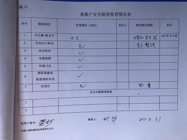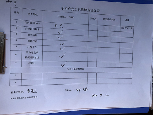 2020年8月,南通云翔機械派專人對承租戶一一簽訂安全協議,并落實每月一次的安全隱患排查。專項檢查員鄧工認真仔細地對承租戶隱患和臺賬進行排查,對部分租戶滅火器偏少、出口標志等不到位的通知整改,并落實整改后的檢查,要求承租戶建立安全臺賬,特別是到了秋冬季,注意消防安全。