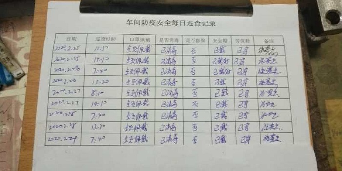 今天是疫情下復(fù)工的第四天,一大早,車間施主任就提醒員工們寫好每日兩點(diǎn)行程軌跡,要求員工工作期間不聚眾聊天,不隨意外出,回家后不隨意到人多的地方,盡量居家。每日行程表的填寫,是對(duì)自己每日遵守復(fù)工防疫規(guī)則的回顧,也是提醒自己后面疫情不散,防控不減。車間主任每日上下午不定時(shí)巡查,做好防疫安全巡查記錄,在保障齒條齒輪生產(chǎn)有序安排的基礎(chǔ)上,產(chǎn)品質(zhì)量管理不放松,防疫安全不放松。云翔機(jī)械齒條齒輪生產(chǎn)的有序復(fù)工,來自管理層的嚴(yán)格與仔細(xì)。